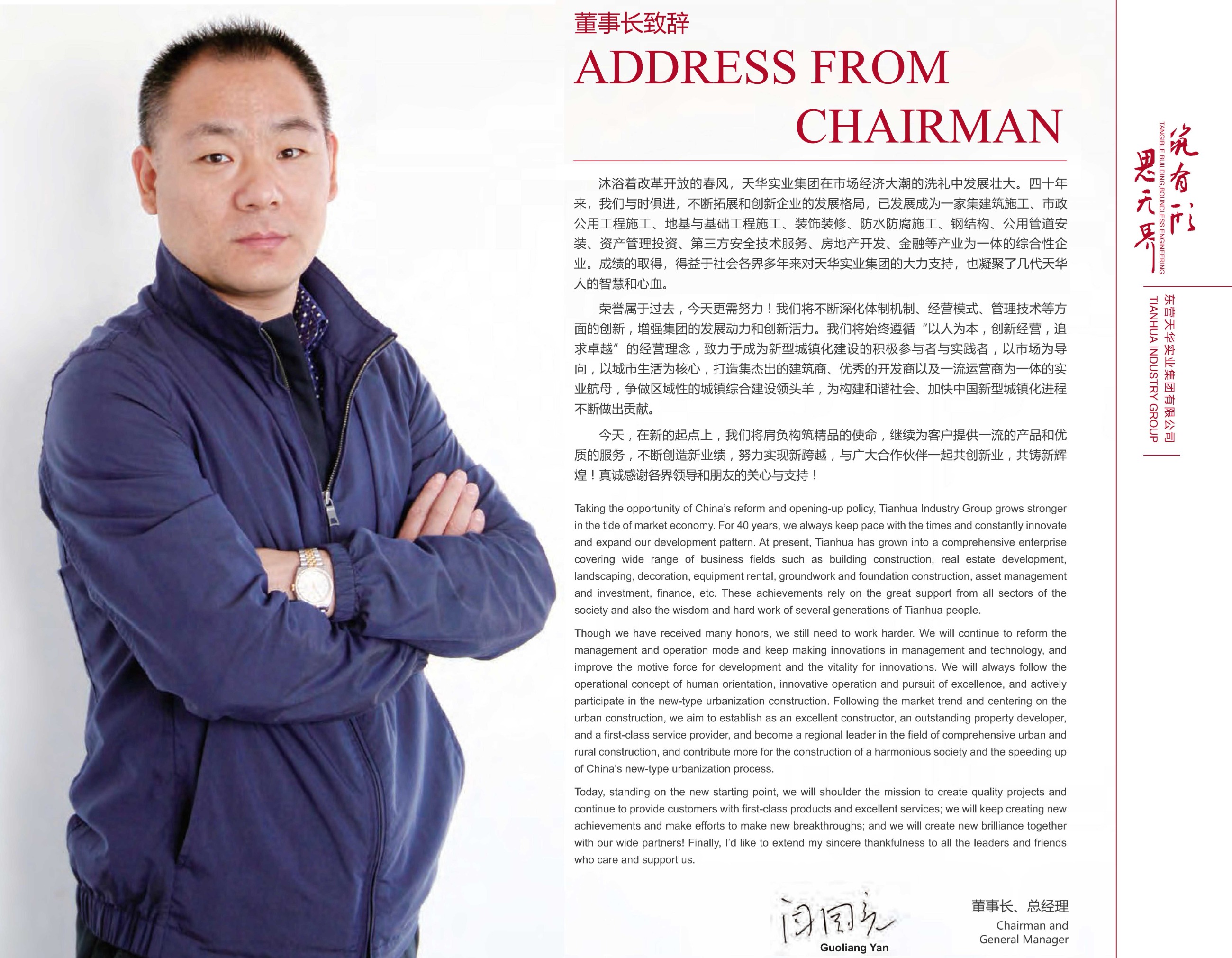 沐浴著改革開放的春風,天華實業(yè)集團在市場經(jīng)濟大潮的洗禮中發(fā)展壯大。四十年來,我們與時俱進,不斷拓展和創(chuàng)新企業(yè)的發(fā)展格局,已發(fā)展成為一家集建筑施工、市政公用工程施工、地基與基礎工程施工、裝飾裝修、防水防腐施工、鋼結構、公用管道安裝、資產(chǎn)管理投資、第三方安全技術服務、房地產(chǎn)開發(fā)、金融等產(chǎn)業(yè)為一體的綜合性企業(yè)。成績的取得,得益于社會各界多年來對天華實業(yè)集團的大力支持,也凝聚了幾代天華人的智慧和心血。榮譽屬于過去,今天更需努力!我們將不斷深化體制機制、經(jīng)營模式、管理技術等方面的創(chuàng)新,增強集團的發(fā)展動力和創(chuàng)新活力。我們將始終遵循“以人為本,創(chuàng)新經(jīng)營,追求超越”的經(jīng)營理念,致力于成為新型城鎮(zhèn)化建設的積極參與者與實踐者,以市場為導向,以城市生活為核心,打造集杰出的建筑商、良好的開發(fā)商以及優(yōu)良運營商為一體的實業(yè)航母,爭做區(qū)域性的城鎮(zhèn)綜合建設領頭羊,為構建和諧社會、加快中國新型城鎮(zhèn)化進程不斷做出貢獻。