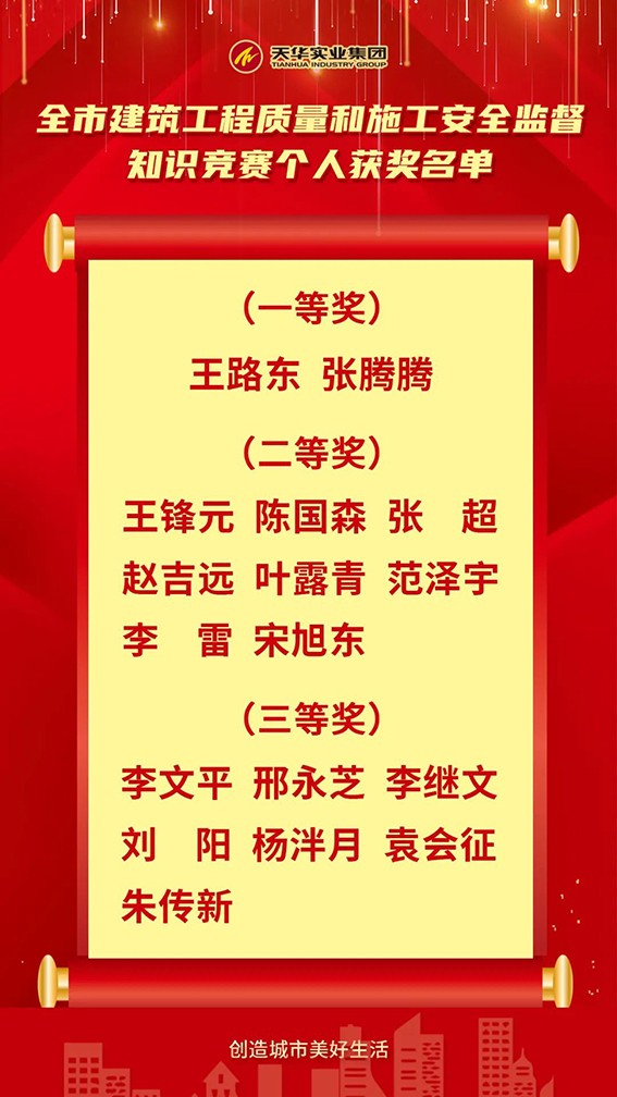 天華實業(yè)集團以此次“建筑工程質量和施工安全監(jiān)督知識競賽”活動為契機,進一步樹牢安全發(fā)展理念,在公司上下掀起廣泛學習熱潮,豐富員工質量、安全生產知識,全力鍛造出一支高水平的一線技術質量安全管理隊伍,為公司高質量發(fā)展提供安全保障。