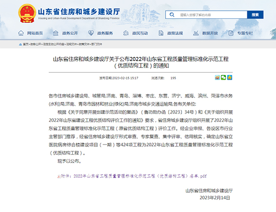 近日,山東省住房和城鄉(xiāng)建設(shè)廳公布2022年山東省工程質(zhì)量管理標(biāo)準(zhǔn)化示范工程(優(yōu)質(zhì)結(jié)構(gòu)工程)獲獎名單,天華實業(yè)集團(tuán)所承攬的廣饒魯商城市廣場1#樓及地下車庫項目榜上有名,榮獲2022年度山東省工程質(zhì)量管理標(biāo)準(zhǔn)化示范工程(優(yōu)質(zhì)結(jié)構(gòu)工程)。這是天華實業(yè)集團(tuán)踐行“創(chuàng)造城市美好生活”的企業(yè)使命,致力打造精品工程的又一成果。