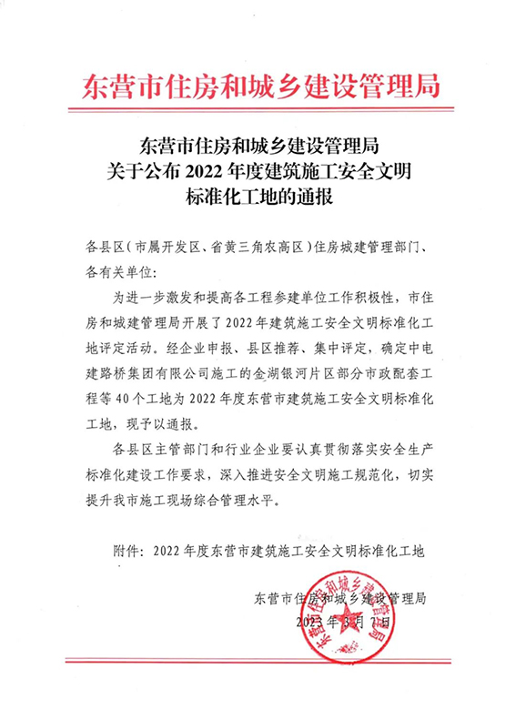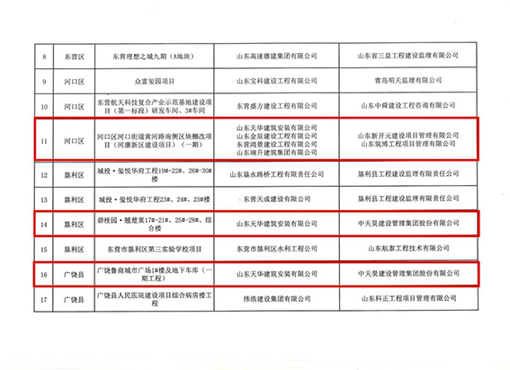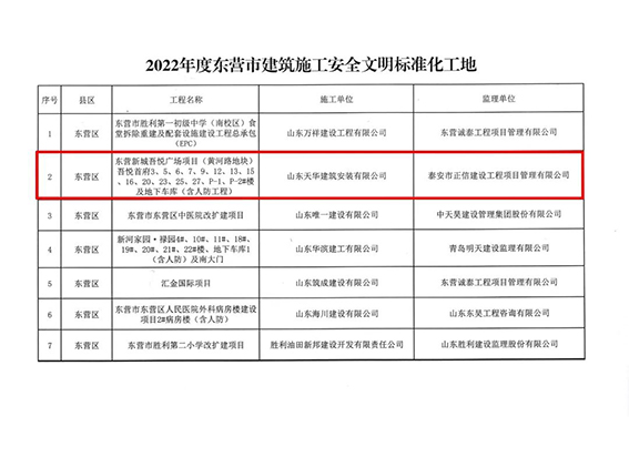 3月7日,東營市住房和城鄉(xiāng)建設(shè)管理局公布“2022年度建筑施工安全文明標(biāo)準(zhǔn)化工地”名單,天華實(shí)業(yè)集團(tuán)承建的東營新城吾悅廣場項(xiàng)目吾悅首府工程、河口區(qū)河康新區(qū)建設(shè)項(xiàng)目(一期)、墾利區(qū)碧桂園·翹楚棠工程、廣饒魯商城市廣場1#樓及地下車庫工程、廣饒縣城南片區(qū)棚戶區(qū)改造項(xiàng)目共5個(gè)項(xiàng)目光榮上榜。