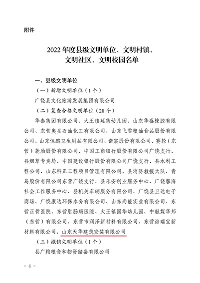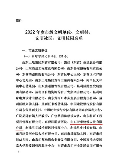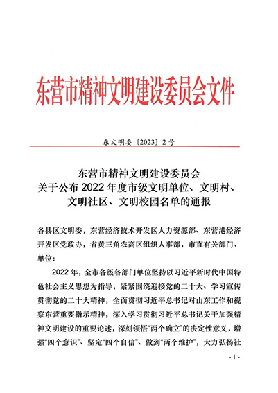 近日,東營(yíng)市和廣饒縣精神文明建設(shè)委員會(huì)相繼下發(fā)表彰文件,天華實(shí)業(yè)集團(tuán)榮獲2022年度東營(yíng)市級(jí)、廣饒縣級(jí)文明單位榮譽(yù)稱號(hào),這標(biāo)志著集團(tuán)精神文明建設(shè)工作邁上新的臺(tái)階。