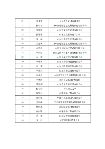 近日,山東省鋼結(jié)構(gòu)行業(yè)協(xié)會召開了2023年度山東省鋼結(jié)構(gòu)行業(yè)協(xié)會專家評審會,根據(jù)《山東省鋼結(jié)構(gòu)行業(yè)協(xié)會章程》和相關(guān)文件規(guī)定評審,經(jīng)過名單公示,天華實業(yè)集團李雷成功入選山東省鋼結(jié)構(gòu)行業(yè)協(xié)會專家委員會(第三批)。
