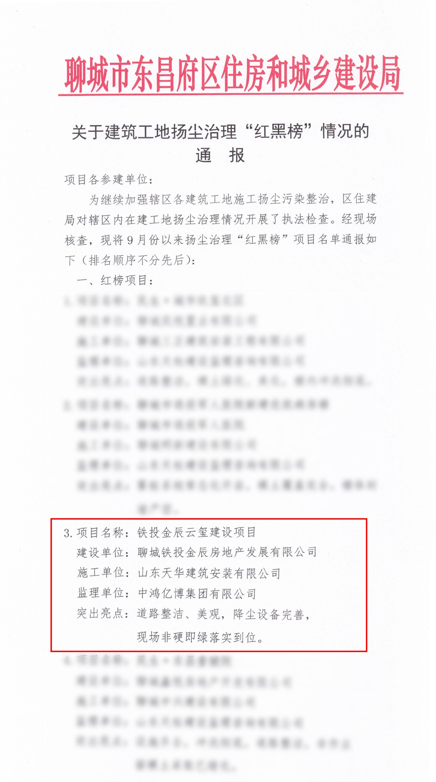 近日,聊城市東昌府區(qū)住房和城鄉(xiāng)建設局公布了《關于建筑工地揚塵治理“紅黑榜”情況的通報》,天華實業(yè)集團承建的聊城鐵投金辰云璽項目榮錄“紅榜項目”名單,得到東昌府區(qū)住房和城鄉(xiāng)建設局的充分肯定與表揚。