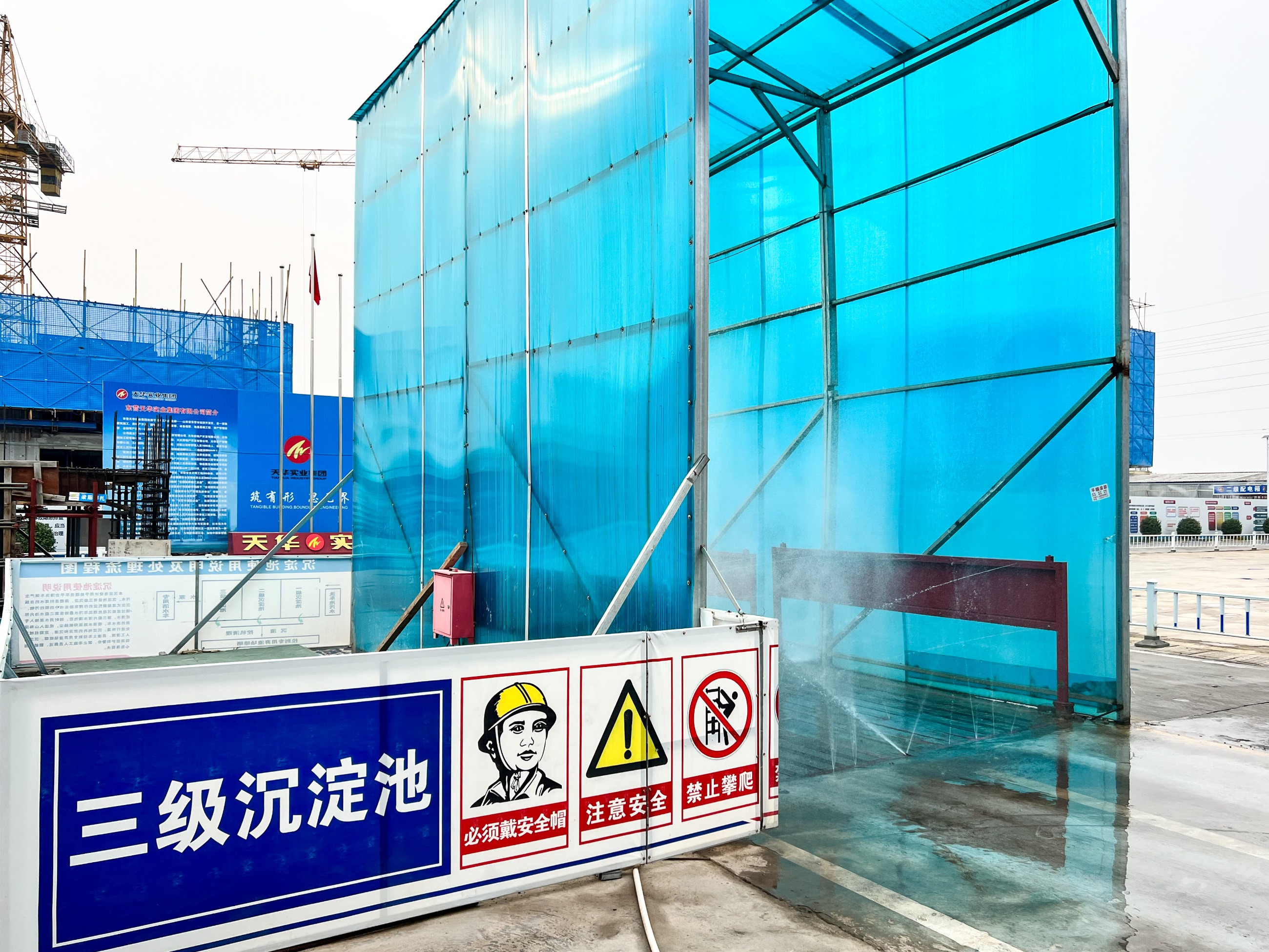 工地裝置洗車臺和沉淀池,工程車駛離工地必須進洗車槽沖洗后,再由工人用水管對即將駛離車輛進行二次沖洗,確保每一車輛不帶泥、塵土上路。