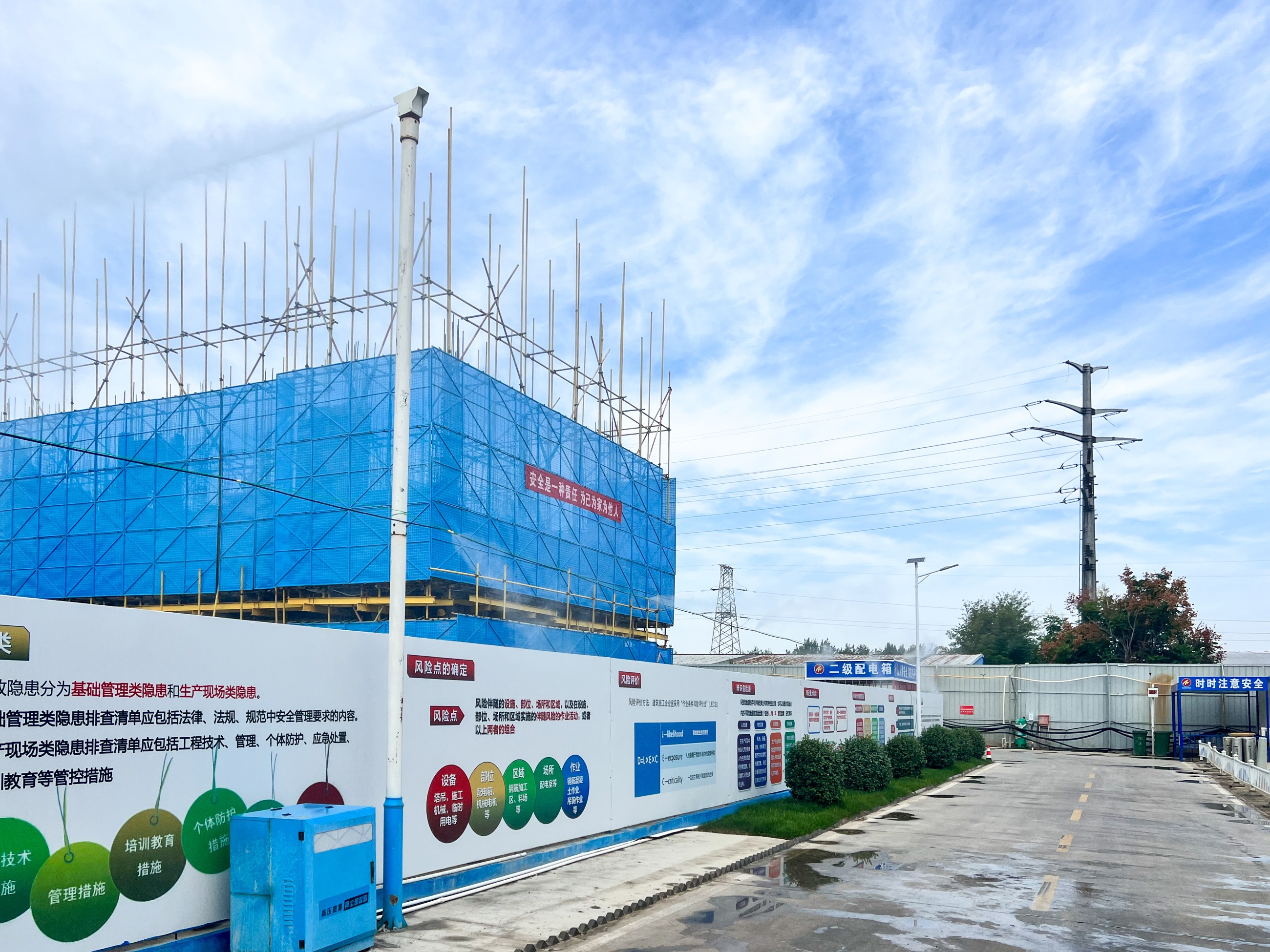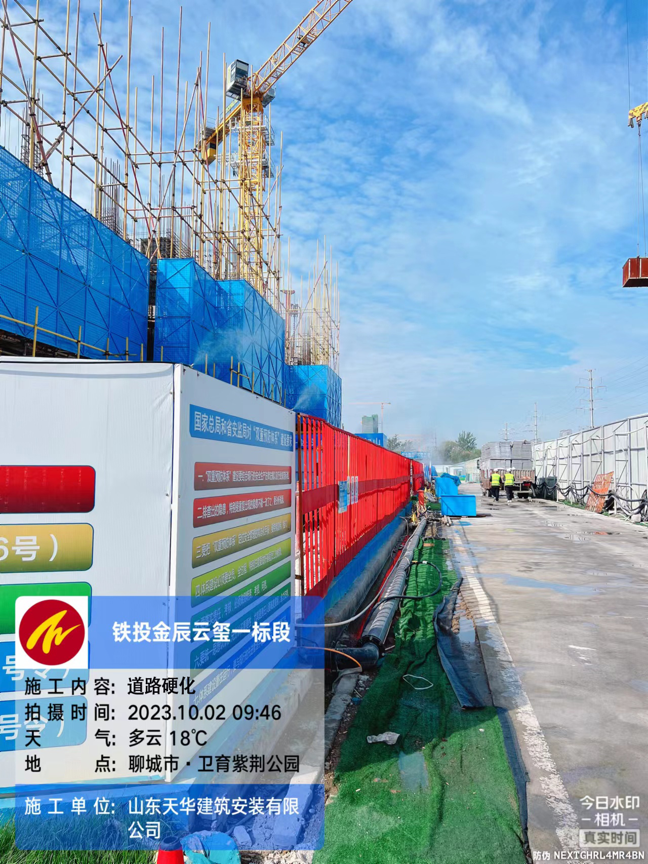 施工現(xiàn)場實行封閉管理,連續(xù)設置4米的高硬質圍擋,圍擋架設噴淋系統(tǒng),且全天處于開啟狀態(tài),道路干凈潮濕無揚塵。