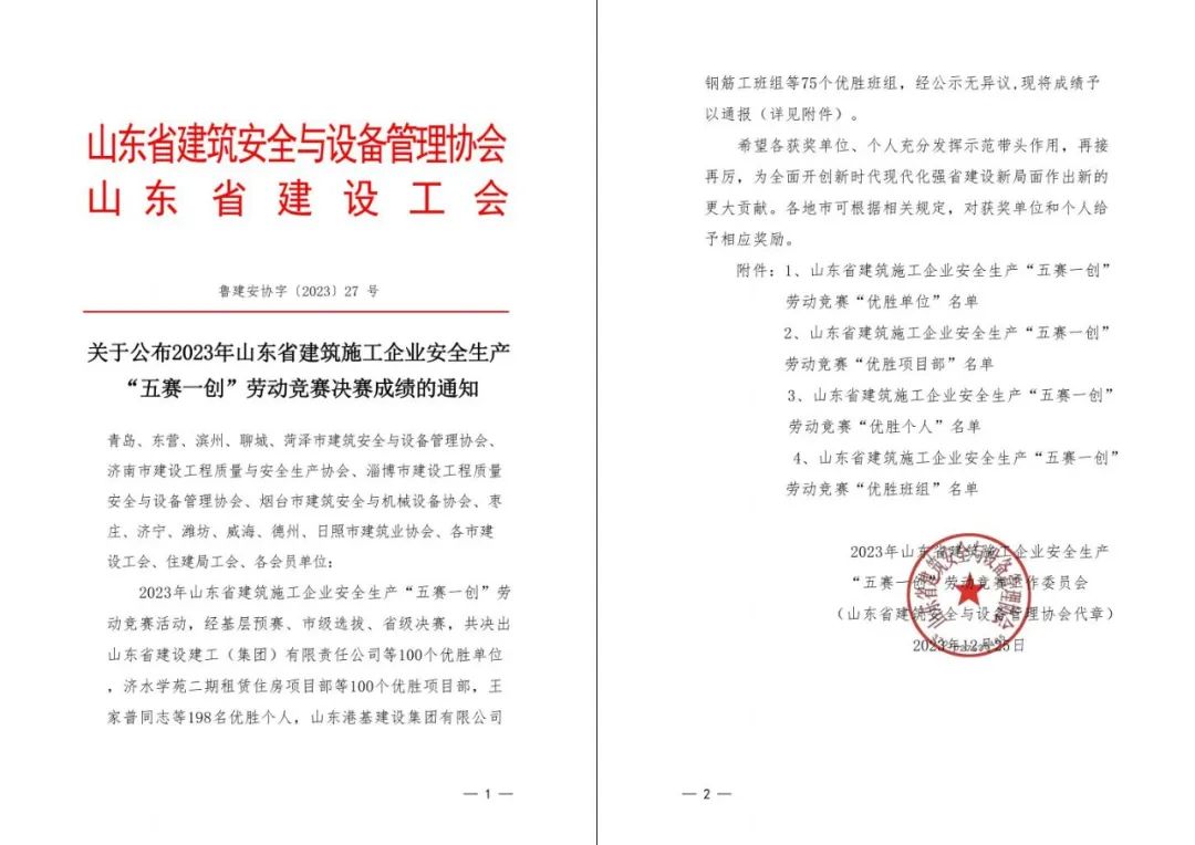 劉海杰、趙吉遠、徐五朋、王文曉榮獲“山東省建筑施工企業(yè)安全生產(chǎn)‘五賽一創(chuàng)’勞動競賽‘優(yōu)勝個人’”稱號。