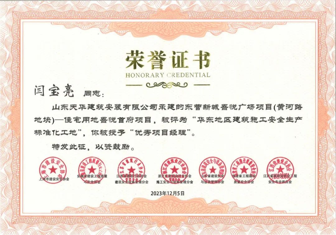 近日,山東省建筑安全與設(shè)備管理協(xié)會傳來喜訊,由天華實業(yè)集團承建的吾悅首府項目被評為“華東地區(qū)建筑施工安全生產(chǎn)標準化工地”,同時授予項目負責(zé)人閆寶亮“優(yōu)秀項目經(jīng)理”稱號。