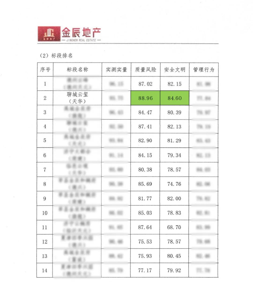 德州金辰地產(chǎn)委托上海平大建筑工程管理咨詢有限公司作為第三方,對項目行為管理及實體質(zhì)量管理情況進(jìn)行檢查,依據(jù)《金辰地產(chǎn)工程管理考核制度》評分規(guī)則,通過對照工程項目中的實測實量、質(zhì)量風(fēng)險、安全文明、管理行為等方面進(jìn)行量化打分,最終,聊城云璽一標(biāo)段在質(zhì)量風(fēng)險、安全文明兩個領(lǐng)域雙雙得冠。