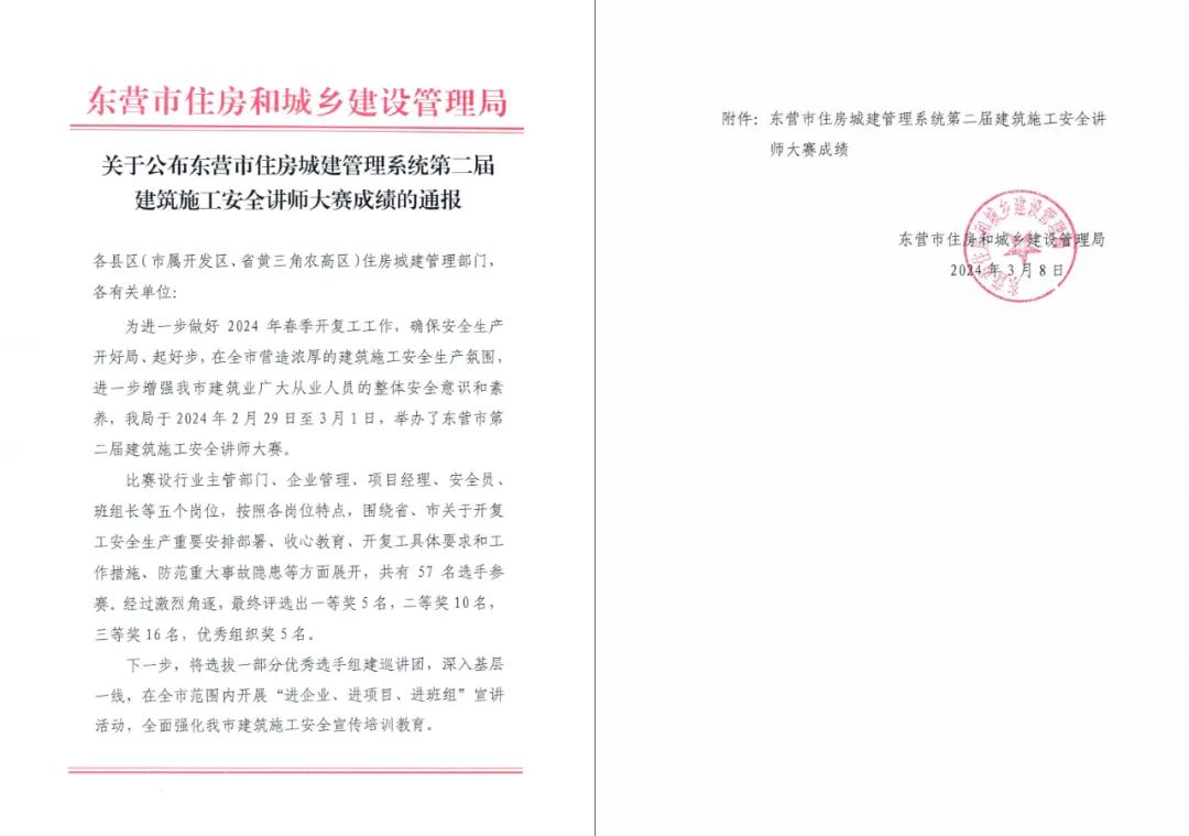 近日,天華實業(yè)集團在東營市第二屆建筑施工安全講師大賽中再創(chuàng)佳績。4名安全講師從57名參賽選手中脫穎而出,其中聊城鐵投金辰云璽項目部宋傳崗榮獲安全員崗位一等獎;集團工程部張騰騰榮獲企業(yè)管理崗位二等獎;匯富尚悅居項目部武強強、廣饒怡和府項目部邱守洋榮獲項目經(jīng)理崗位三等獎,充分展現(xiàn)了公司安全講師團隊的實力。