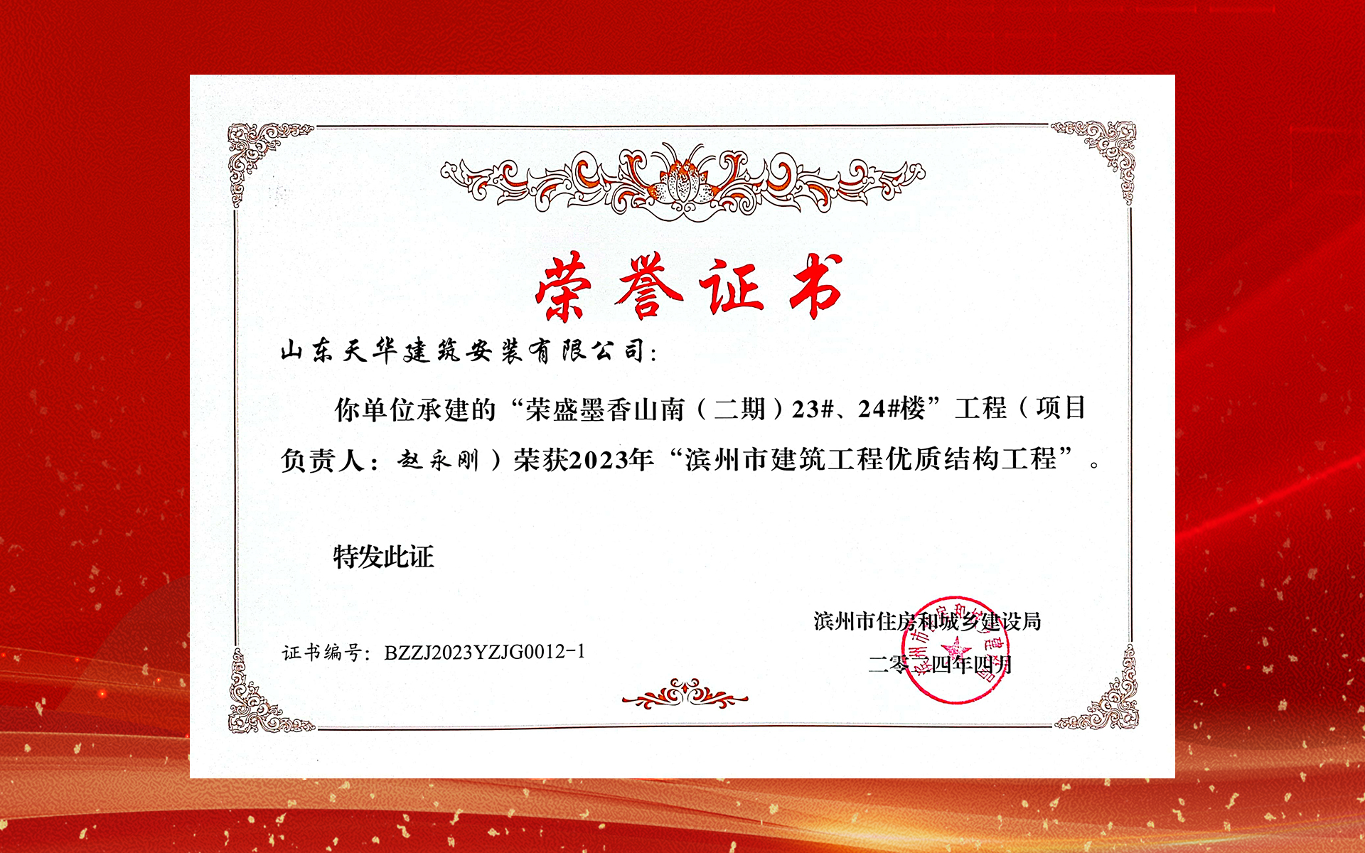 近日,濱州市住房和城鄉(xiāng)建設(shè)局公布2023年度“濱州市房屋建筑和市政工程優(yōu)質(zhì)結(jié)構(gòu)工程”評(píng)選結(jié)果,由天華實(shí)業(yè)集團(tuán)承建的榮盛·墨香山南、濱州冠軍度假村兩個(gè)項(xiàng)目榮獲“2023年濱州市建筑工程優(yōu)質(zhì)結(jié)構(gòu)工程”榮譽(yù)稱號(hào)。