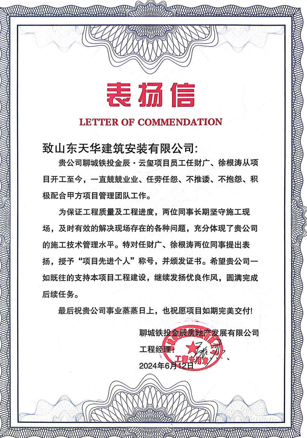 在巡檢結(jié)果公布當(dāng)日,天華實(shí)業(yè)集團(tuán)收到聊城鐵投金辰房地產(chǎn)發(fā)展有限公司表揚(yáng)信,聊城云璽項(xiàng)目部任財(cái)廣、徐根濤兩位同事榮獲“項(xiàng)目先進(jìn)個(gè)人”稱號(hào)。信中指出,為保證工程質(zhì)量及工程進(jìn)度,兩位同事長期堅(jiān)守施工現(xiàn)場,及時(shí)有效的解決現(xiàn)場存在的各種問題。不僅展現(xiàn)了個(gè)人超強(qiáng)的協(xié)調(diào)以及管理能力,也體現(xiàn)了天華人迎難而上、永不退縮的拼搏精神。