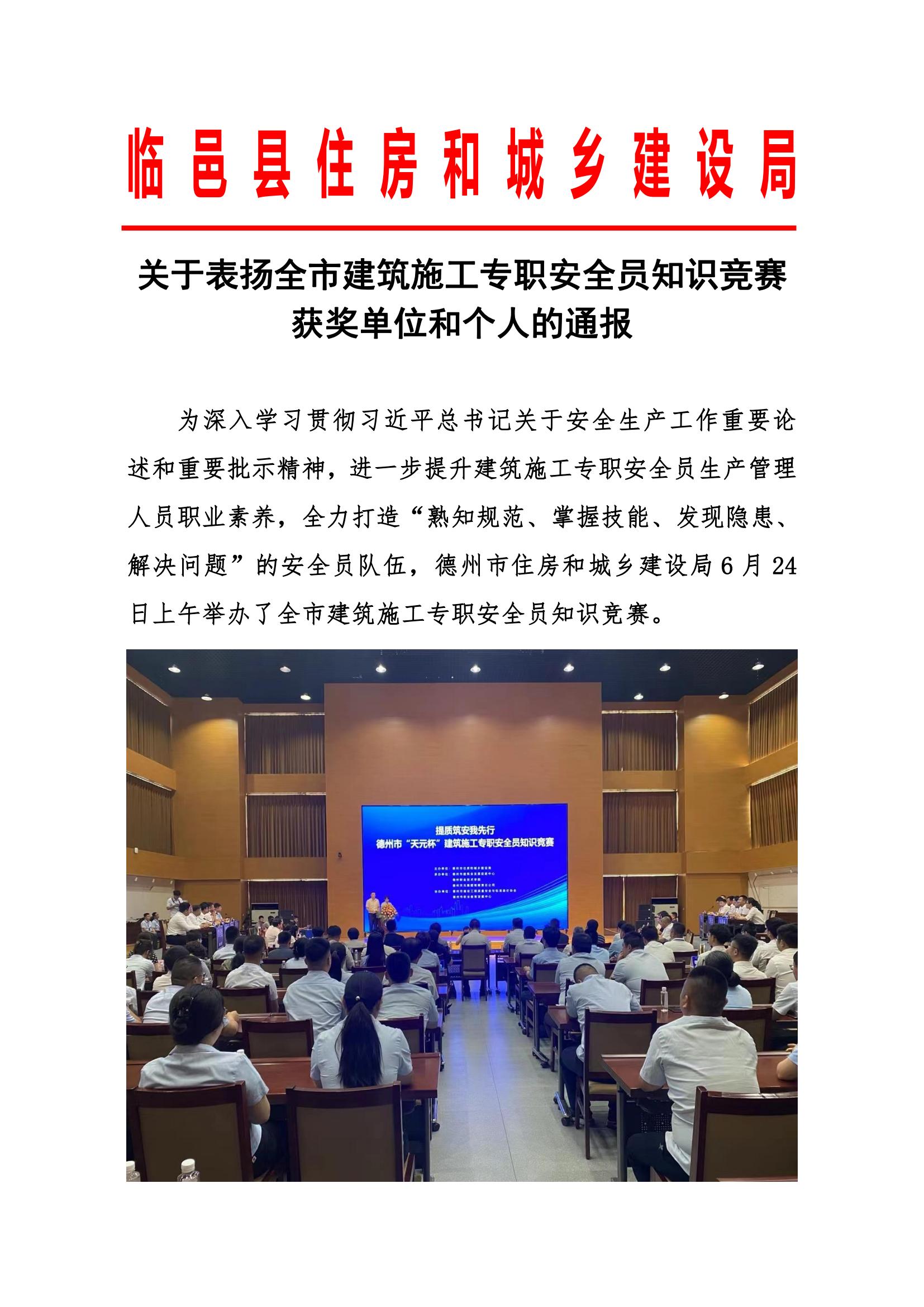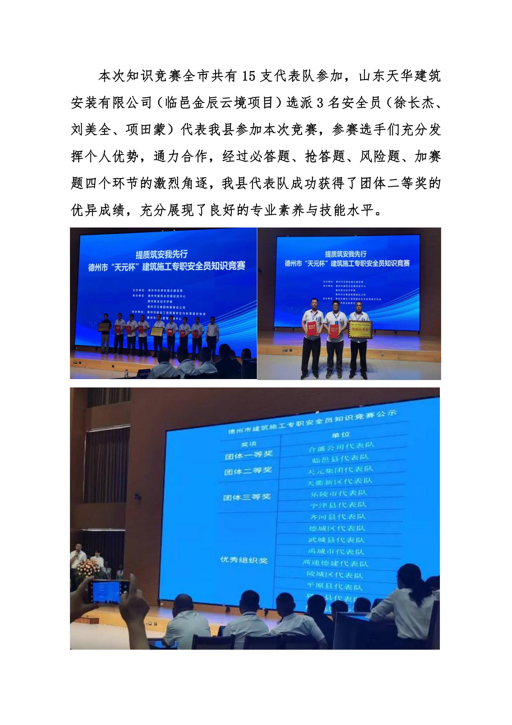 近日,天華實業(yè)集團臨邑金辰雲(yún)境項目部選派徐長潔、劉美全、項田蒙三人,代表臨邑縣參加德州市建筑施工專職安全員知識競賽,并榮獲團體二等獎。臨邑縣住房和城鄉(xiāng)建設局印發(fā)通報,對天華實業(yè)集團金辰雲(yún)境項目部給予表揚,并在本年度安全生產(chǎn)考評中給予加分獎勵。“安全監(jiān)督的責任,就是把各項安全規(guī)章制度、管理措施落到實處。”項田蒙三人覺得,沒有隱患,就是最好的成績。