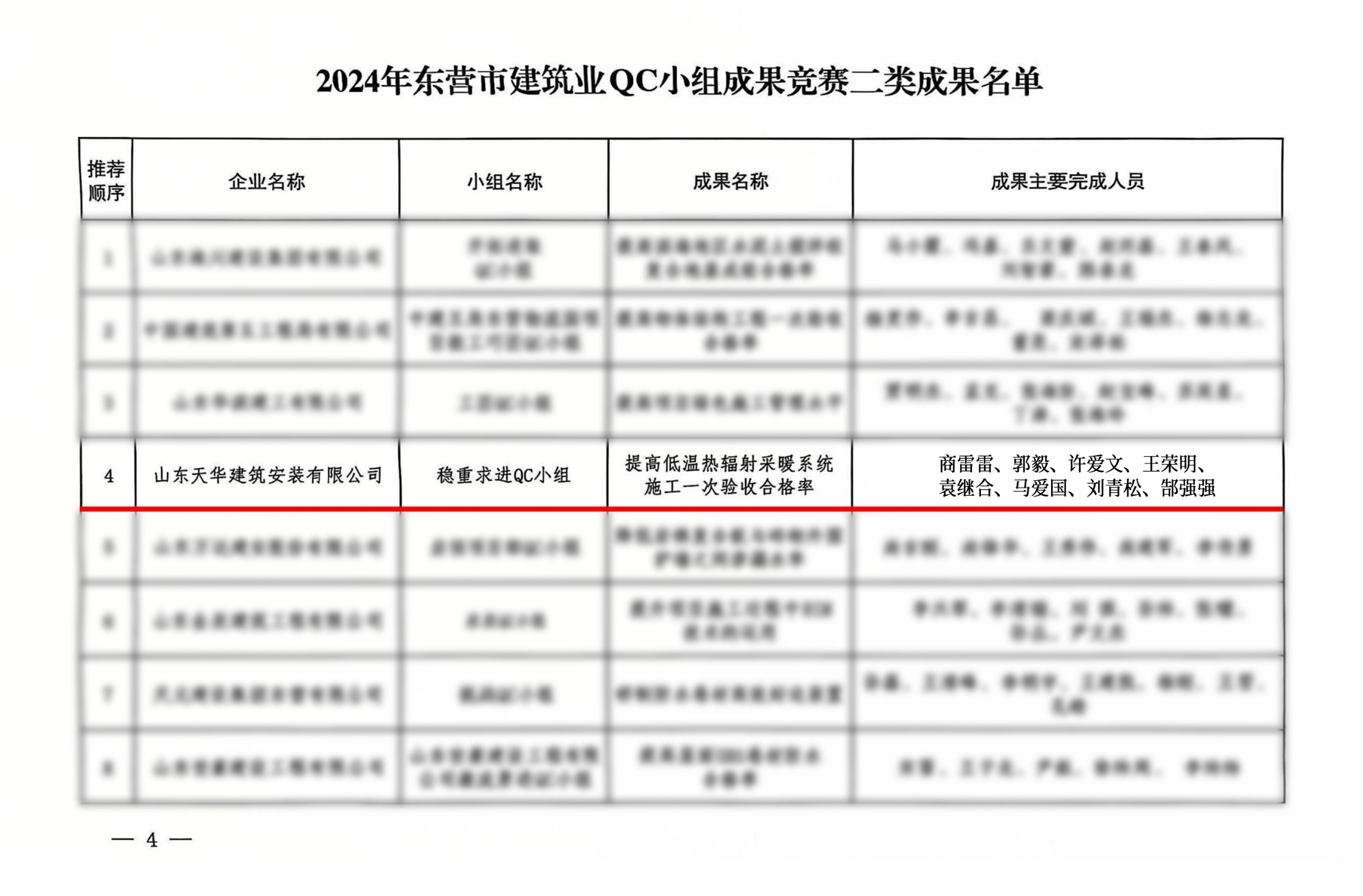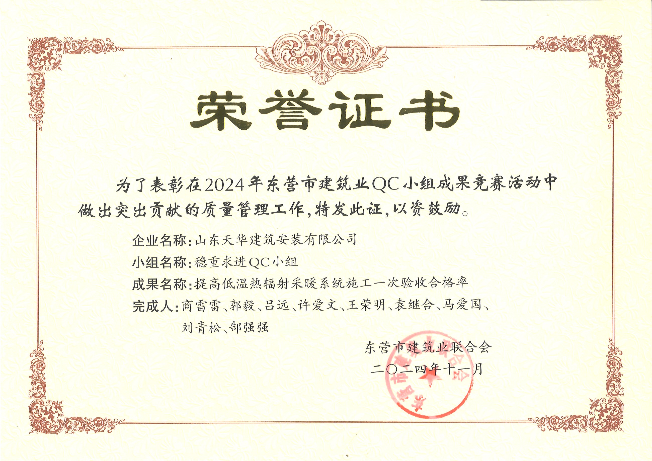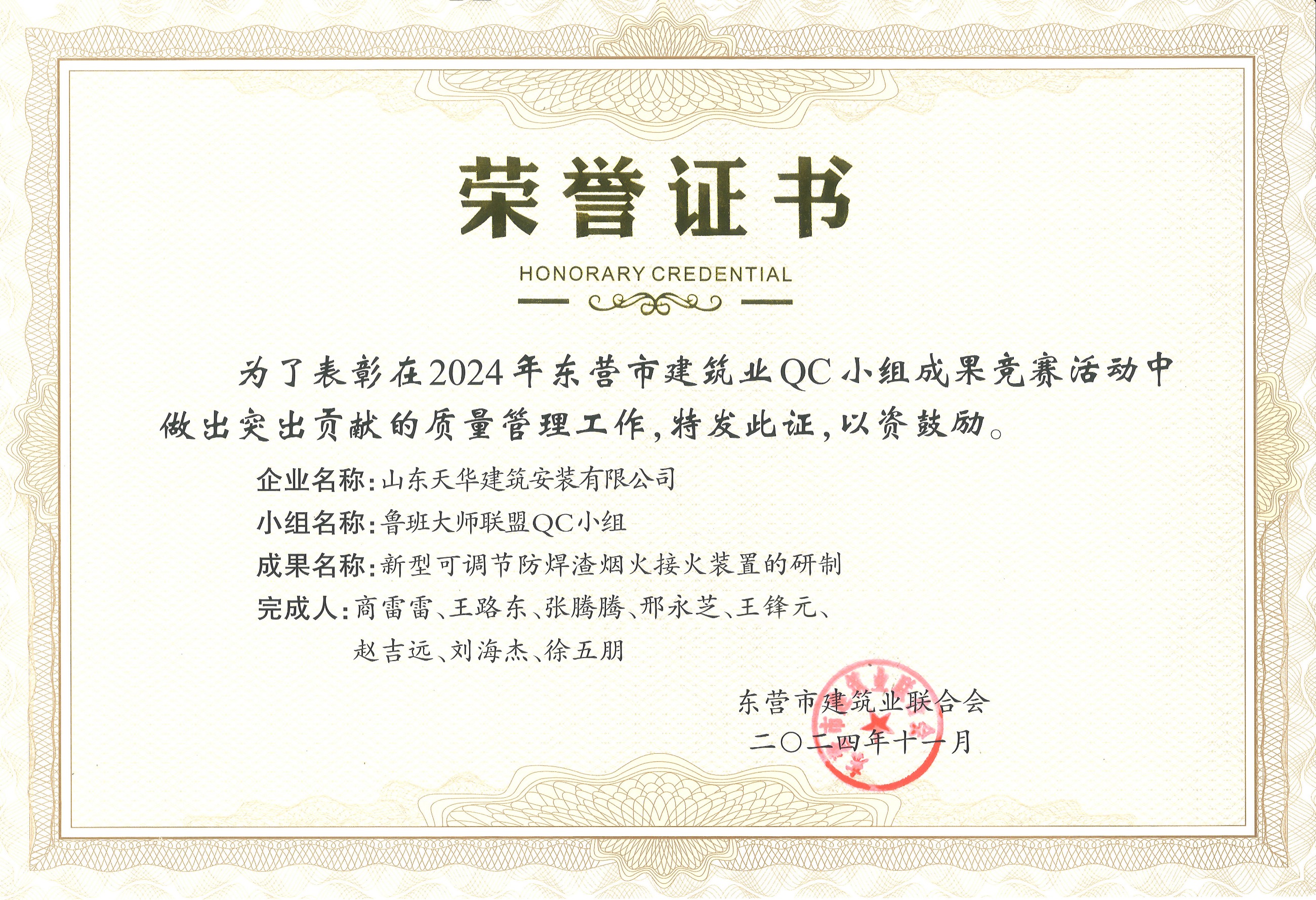 近日,東營市建筑業(yè)聯(lián)合會印發(fā)《關(guān)于公布2024年度東營市建筑業(yè)QC小組成果競賽獲獎成果的通知》,天華實業(yè)集團QC小組完成的“新型可調(diào)節(jié)防焊渣煙火接火裝置的研制”“提高低溫熱輻射采暖系統(tǒng)施工一次驗收合格率”兩項成果分別榮獲競賽一、二等獎。