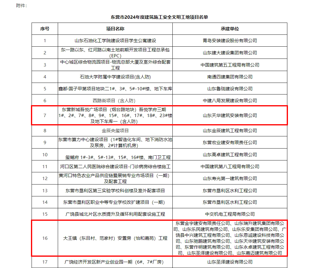 近日,東營市2024年度建筑施工安全文明工地評選結(jié)果揭曉,天華實業(yè)集團承建的東營新城吾悅學(xué)府項目、大王怡和嘉苑項目憑借卓越的工程質(zhì)量、施工安全及文明施工表現(xiàn),成功榮獲“安全文明工地”稱號。充分彰顯了企業(yè)品質(zhì)建設(shè)、匠心筑造的實力擔(dān)當(dāng)。