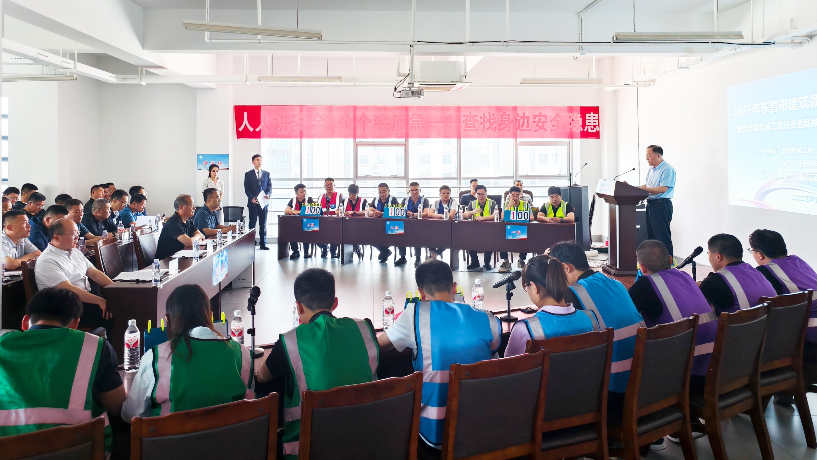 中共東營市住房和城鄉(xiāng)建設管理局黨組書記張玉明出席活動并講話,東營市總工會四級調研員李秀東,市住房和城鄉(xiāng)建設管理局黨組成員、副局長俞海泓,市建設工程施工安全管理站站長陳月強,市建設工程安全與設備管理協(xié)會會長、天華實業(yè)集團安全總監(jiān)商雷雷,以及各縣區(qū)住房建設局分管負責人,各安全監(jiān)督管理機構主要負責人參加活動。來自全市51家單位的近百余名選手參賽。
