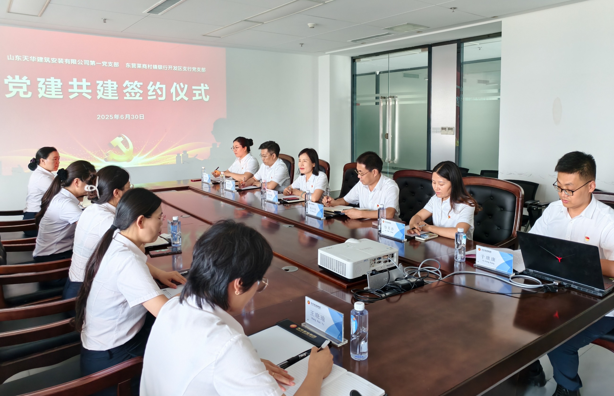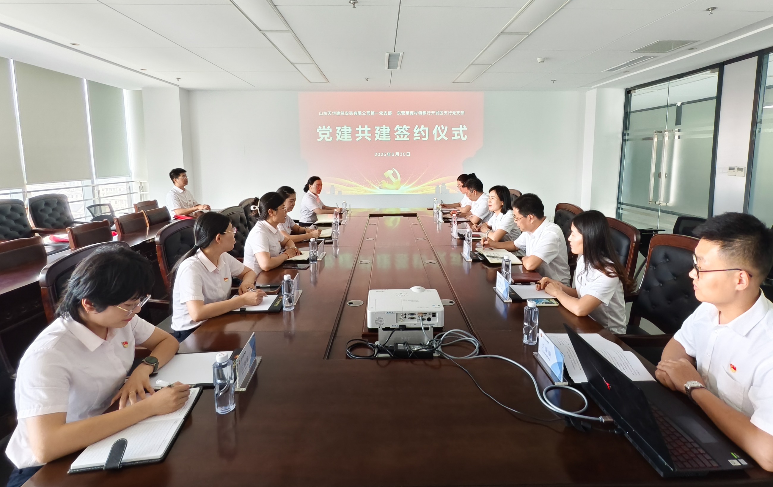 在“七一”建黨節(jié)來臨之際,為進一步深化銀企合作關(guān)系,構(gòu)建“優(yōu)勢互補、合作共贏”的黨建工作新格局,6月30日下午,山東天華建筑安裝有限公司第一黨支部與東營萊商村鎮(zhèn)銀行開發(fā)區(qū)支行黨支部舉行黨建共建簽約儀式,標志著雙方在黨建引領(lǐng)下開啟全方位、深層次的戰(zhàn)略合作新篇章。山東天華第一黨支部書記徐帥菊,東營萊商村鎮(zhèn)銀行開發(fā)區(qū)支行黨支部委員、副行長趙桃紅出席儀式,雙方單位相關(guān)支部黨員參加活動。