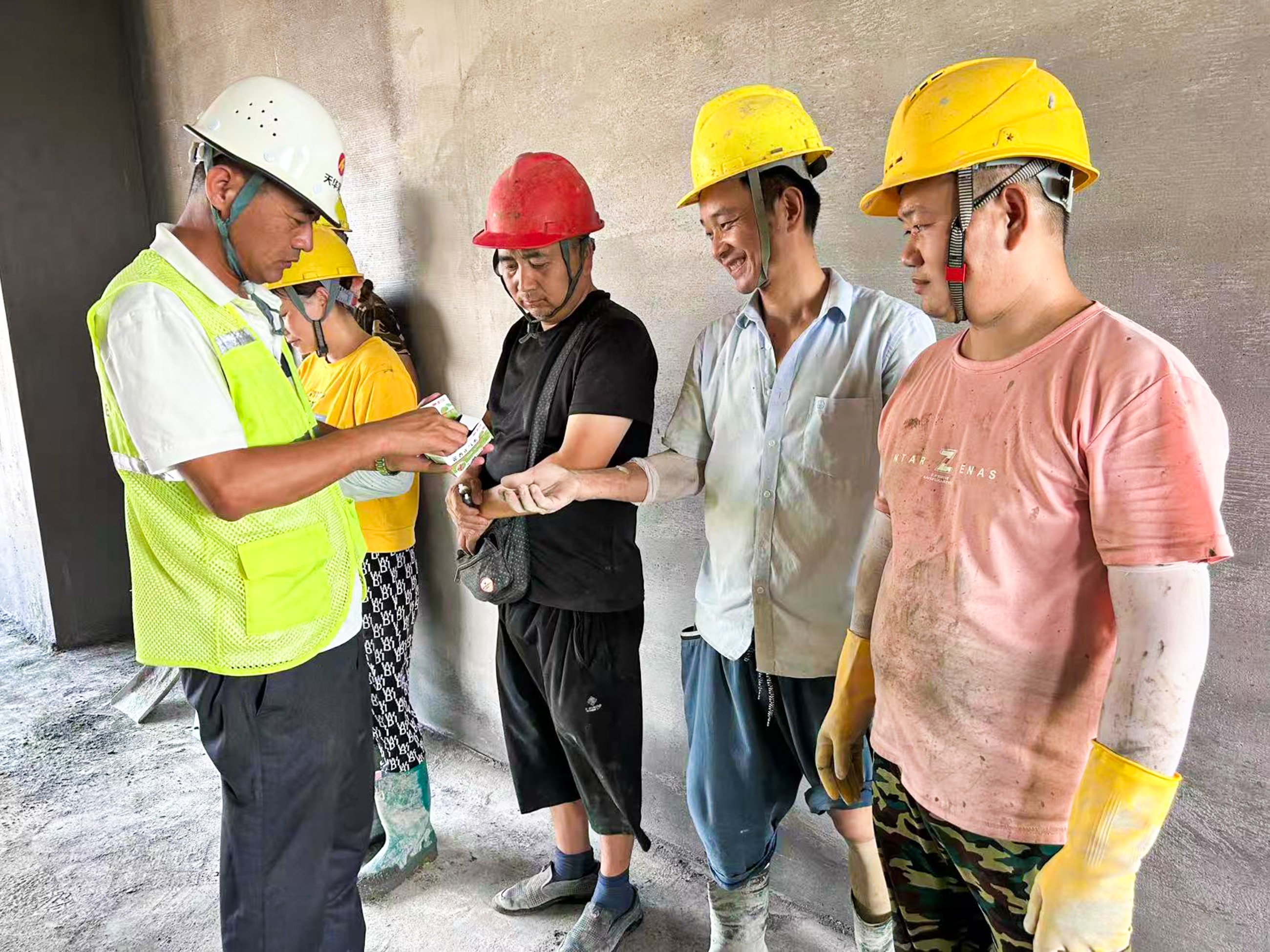 烈日炙烤下,地表溫度突破35℃,安全帽下的臉龐被汗水浸透,卻絲毫擋不住搶時間、趕進(jìn)度的決心。為保障施工進(jìn)度和工人健康,項(xiàng)目團(tuán)隊(duì)調(diào)整了作業(yè)時間,實(shí)行錯峰機(jī)制,避開高溫時段,利用早晚時間搶工期,確保每道工序達(dá)到質(zhì)量標(biāo)準(zhǔn);同時配備了防暑藥品、綠豆湯、遮陽棚等物資,讓工人在安全健康的前提下全力沖刺。