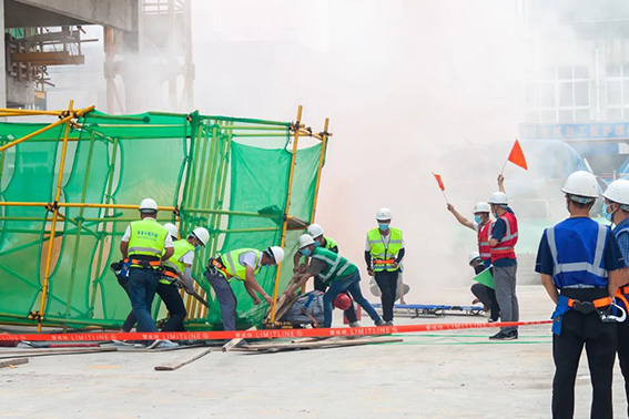 本次演練現(xiàn)場模擬了落地式操作平臺坍塌并引發(fā)火災(zāi)的綜合事故演練。事故發(fā)生后,現(xiàn)場安全員第一時間向指揮部匯報事故情況,項目負責(zé)人立即啟動應(yīng)急預(yù)案,組織人員對事故現(xiàn)場進行警戒隔離、應(yīng)急搶險,公安、醫(yī)療等救護部門立即到達現(xiàn)場進行救援,成功將受傷人員營救出事故現(xiàn)場,迅速完成了各項演練任務(wù)。