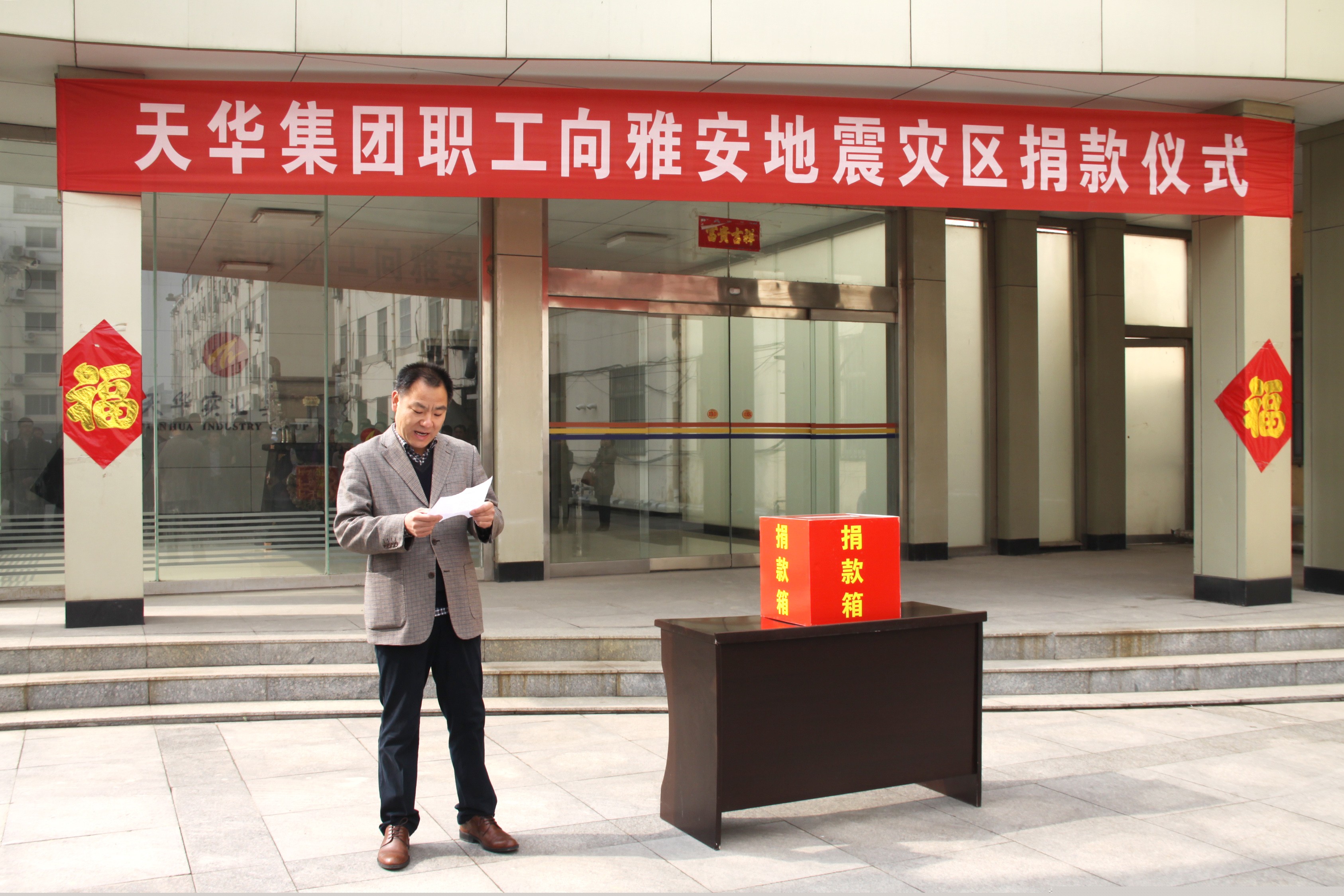 4月20日,四川雅安發(fā)生了7級(jí)地震,造成了重大的人員傷亡和財(cái)產(chǎn)損失。地震無(wú)情人有情,天華集團(tuán)于4月22日在集團(tuán)公司院內(nèi)召集全員舉行捐款儀式,董事長(zhǎng)閆國(guó)亮發(fā)表捐款動(dòng)員講話,他倡議要繼續(xù)發(fā)揚(yáng)“一方有難、八方支援,患難相恤、守望相輔”的中華民族傳統(tǒng)美德,指出“企業(yè)和每一個(gè)人都是社會(huì)細(xì)胞的組成部分,應(yīng)該承擔(dān)應(yīng)有的社會(huì)責(zé)任”,鼓勵(lì)大家用實(shí)際行動(dòng)彰顯博愛情懷,支援雅安災(zāi)區(qū)人民。
